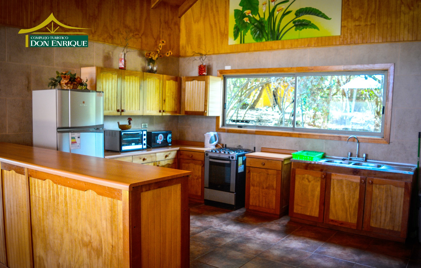 La cocina cuenta con refrigerador, cocina 4 hornillas, horno microondas, hervidor, vajilla, ollas y utensilios de cocina